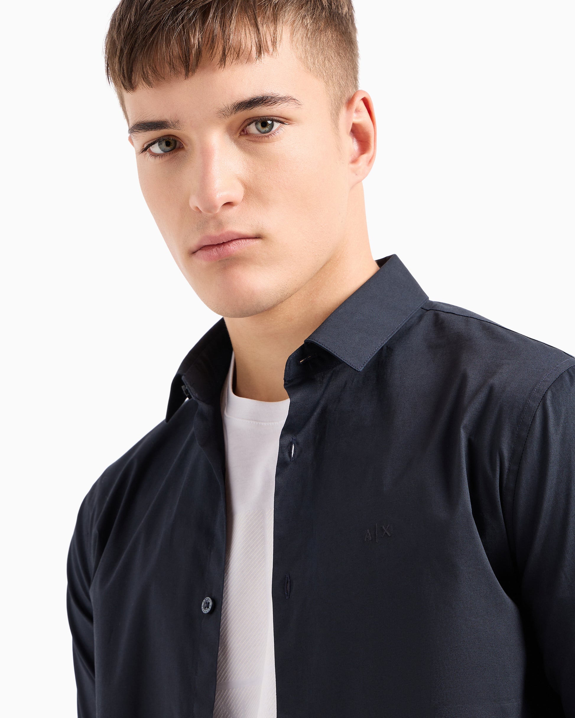 Camicia slim fit in popeline elasticizzato. Questa camicia è caratterizzata da un design essenziale con colletto classico, piccolo logo ricamato sul petto, bottoni sul davanti e polsini con bottoni.